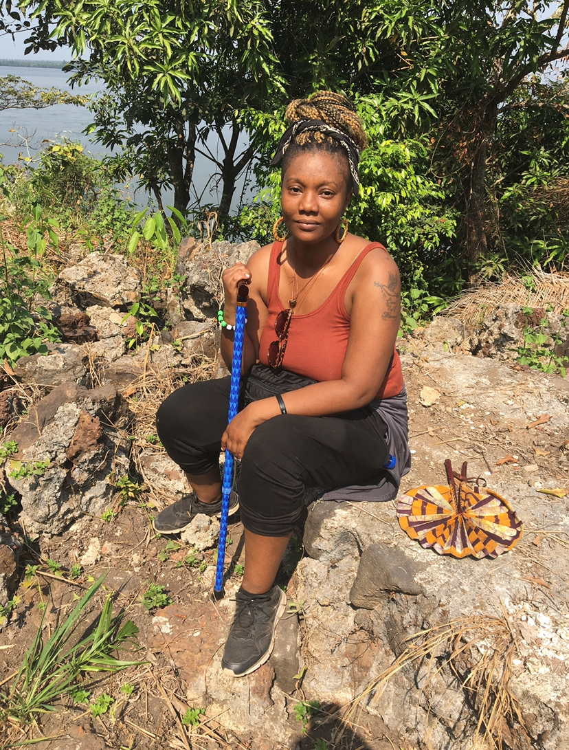 free Black woman sitting at Bunce Island Slave Castle - in the pen where enslaved women and children were held - Sierra Leone, West Africa, 2019